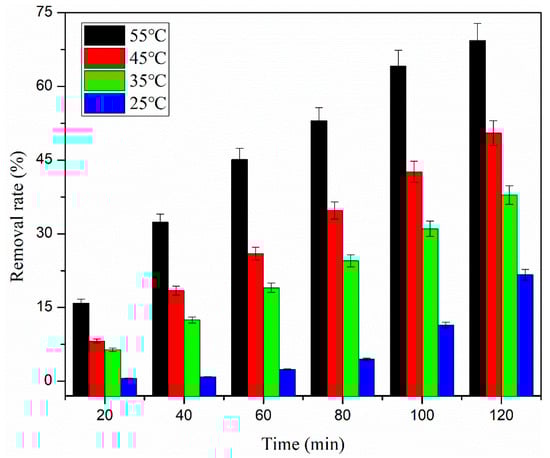 Figure 6 shows the trends of ciprofloxacin removal at different reaction temperatures. The removal rates of ciprofloxacin were 22.1%, 37.4%, 50.7%, and 68.6% at 25 °C, 35 °C, 45 °C, and 55 °C, respectively. The experimental results showed that the removal effect of ciprofloxacin was significantly enhanced with the increase in the reaction temperature. The removal rate at 55 °C was more than three times that at 25 °C. It is evident that temperature has a greater effect on the removal of ciprofloxacin by US/E/PS system. This may be due to the following reasons [,]: (1) the increase in reaction temperature enhances the effective collision between reactant molecules, resulting in a faster reaction rate; (2) higher reaction temperature reduces the dissolved oxygen content and weakens the competition of O2 for  to gain electrons; (3) the increase in reaction temperature added thermal activation to the ultrasonic activation and electrical activation of , so that more  is produced. In the real ciprofloxacin degradation process, the room temperature is near 35 °C, which is why it was chosen for the experiment.