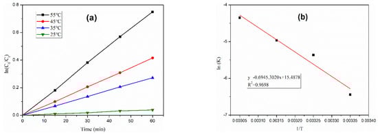where, C0 is the initial substrate concentration, mmol/L; Ct is the substrate concentration at time t, mmol/L; t is reaction time, min; k is the rate constant, min−1.