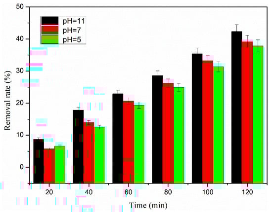 To investigate the effect of initial pH value of the solution on the removal of ciprofloxacin by US/E/PS system, the experimental conditions were set as follows: the initial molar concentration of ciprofloxacin was 0.03 mmol/L, the initial molar concentration of PS was 1.5 mmol/L, the electrode potential was 4 V, the ultrasonic power was 100 W, and the reaction temperature was 35 °C. The pH of the system was adjusted to make the solution acidic, neutral, and alkaline (pH values were 5.0, 7.0, and 11.0, respectively). The trend of ciprofloxacin removal rate after reaction for 120 min is shown in Figure 9. When the solution was acidic (pH = 5.0), neutral (pH = 7.0), and alkaline (pH = 11.0), the removal rates of ciprofloxacin were 37.4%, 39.1%, and 42.3%, respectively. It can be seen that the removal effect of ciprofloxacin changed slightly as the solution changed from acid to neutral and then to alkaline. The three pKa values of ciprofloxacin are 5.10, 5.85, and 8.10, with three existential morphologies under different solution pH conditions. Since the main mechanism of oxidation of organic matter by  is electron transfer reaction, the existence form of ciprofloxacin in the more alkaline solution was more conducive to the removal of  [,], so the removal effect was better. The pH was set to 5.0 because the initial pH of the real ciprofloxacin wastewater is close to 5.0.
