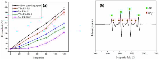 (a) Effect of free radical quenching agents on ciprofloxacin removal, and (b) the EPR experiment result for detecting  and •OH.