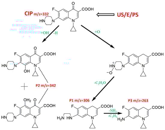 Path of degradation of ciprofloxacin by the US/E/PS system.