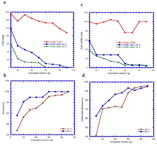 The variation of COD and ADMI with different activated carbon dosages after 24 and 54 h is shown in Figure 2. Dosages of 45 and 30 g of activated carbon were required to completely remove the COD by adsorption of the dye wastewater for 24 and 52 h, respectively, under an initial COD concentration of 88–136 mg/L (Figure 2a,b). Variation in the decrease and removal trend of ADMI with the respective activated carbon dosages for 24 and 52 h were similar to the COD variation (Figure 2c,d). The ADMI decreased with an increase in the dosage of activated carbon. After 24 and 52 h of adsorption by activated carbon, the residual ADMI were 4–5 and 5–7, respectively. The removal efficiency of ADMI increased from 88–96% to 90–95% as the dosage of activated carbon became ≥30 g.