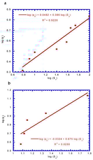 Ka and n represent the index of adsorption capacity and intensity, respectively [,]. A plot of log qa versus log Sa yielded a straight line, which was used to determine Ka and 1/n. Ka was computed from the y-intercept, and 1/n was determined from the slope of the regression line. The logarithemic form of the Freundlich isotherm model for COD adsorption by GAC at 24 and 52 h is illustrated in Figure 3. The values of Ka and n, determined from linear regression in Figure 3a, were 1.117 (mg/g)(L/mg)1/n and 2.591, respectively, with a correlation coefficient (R2) of 0.9220. The values of Ka and n, determined from Figure 3b, were 0.928 (mg/g)(L/mg)1/n and 1.481, respectively, with an R2 of 0.8288. The obtained average values of Ka and n were 1.023 ± 0.134 (mg/g)(L/mg)1/n and 2.036 ± 0.785, respectively. The R2 values decreased from 0.9220 to 0.8288 at different sampling times, probably due to the collision of activated carbon particles by stirring.