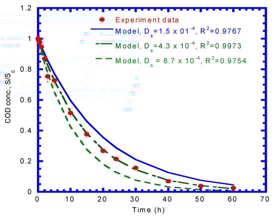where Sw is the substrate concentration at the interface between the liquid and activated carbon (mg COD/L). Figure 4 shows that the COD concentration varied over time. Kinetic model simulation data was obtained by assuming various Ds values, and they were compared with the experimental data. The model and the experimental results were in good agreement, while Ds was equal to a best fit value of 4.3 × 10−4 cm2/d with a correlation coefficient (R2) of 0.9973.