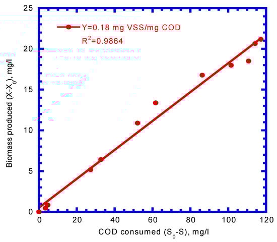 where Y represents the yield coefficient (mg VSS/mg COD), ΔVSS represents the increase in biomass concentration (mg/L), and ΔCOD represents the decrease in COD concentration (mg/L).