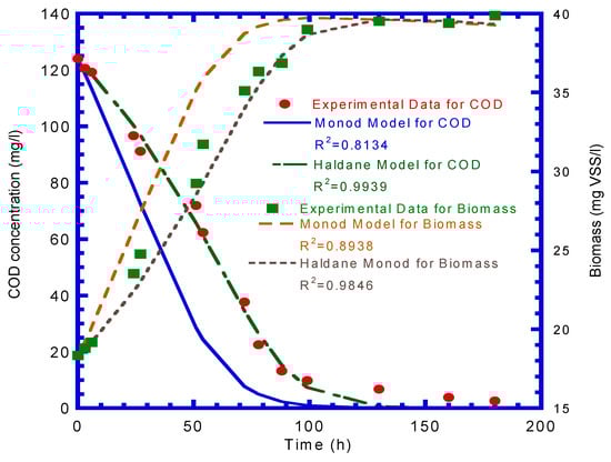 Monod and Haldane kinetics were employed to describe the biomass growth rate as [,] follows.