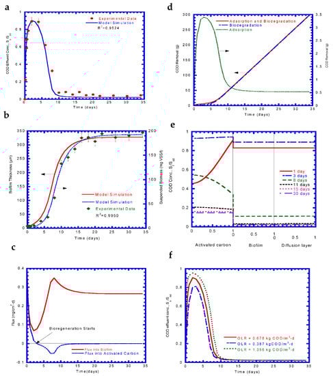 Adsorption and biodegradation were responsible for the substrate removal in the BAC reactor. The substrate removal from the model simulation is shown in Figure 7d. It was observed that COD removal by adsorption increased abruptly, reaching a maximum value after 3 days due to the BAC reactor acting as an efficient COD adsorber. However, the COD removal started to decline after 3 days due to active growth of the biofilm for bioregeneration. COD removal by adsorption ran from day 10 until the end of the test, showing a constant value since the flux into activated carbon approached zero. During days 3–10 of the test, COD removal by biofilm degradation became dominant due to a significant increase in the biofilm thickness at the log-growth phase. The overall COD removal was almost ascribed to biodegradation by the biofilm.