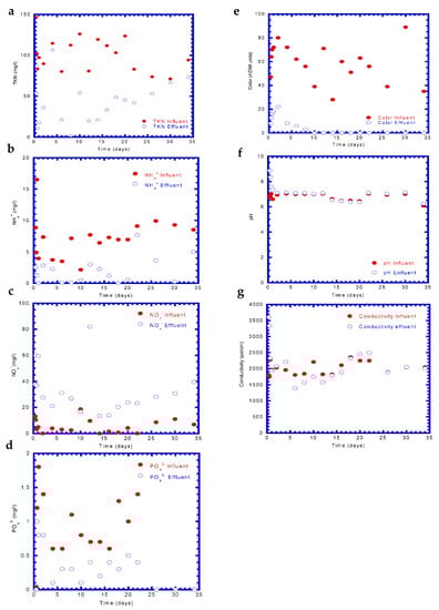Time course of various analyzed substances in the influent and effluent of the BAC reactor: (a) TKN, (b) NH4+, (c) NOx–, (d) PO43–, (e) color, (f) pH, and (g) conductivity.