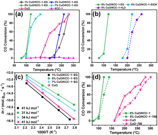 The CO oxidation activity of the CuO/KCC−1 series catalysts were tested, as shown in Figure 3a, from which it can be seen that the dendritic mesoporous molecular sieve KCC−1 composed of SiO2 showed almost no CO catalytic oxidation activity. When the KCC−1 was loaded with a small amount of CuO, the CO catalytic oxidation activity of the catalyst increased and reached an optimum level when the CuO loading reached 5%, with a complete conversion of CO at 120 °C. The CuO loading should not be too high and the activity of the catalyst decreased when the CuO loading reached 7%, with a complete conversion of CO at 160 °C. Pristine CuO exhibited barely satisfactory CO catalytic oxidation activity, and CO could be completely reacted when the reaction temperature reached 280 °C. By comparing the CuO/KCC−1−EG series catalysts with different CuO contents, it was found that 1% CuO/KCC−1−EG has the lowest catalytic activity, and the CO catalytic oxidation activity of the catalysts was boosted and then decreased with the increasing CuO content. The possible reason for this is that KCC−1, which has a high specific surface area and abundant mesoporous pores, has no catalytic activity, but CuO nanoparticles have a certain CO catalytic oxidation activity. The CuO nanoparticles were highly dispersed on the surface of KCC−1 and in the pore channels, making the catalyst exhibit excellent catalytic performance; as the CuO content increased, the number of active components also increased, thus enhancing the catalytic activity; however, as the CuO content increased further, the CuO nanoparticles covered the surface of the KCC−1, blocking part of the molecular sieve catalyst pore channels, leading to a decrease in the specific surface area and pore volume of the samples, which ultimately led to a decrease in the catalytic oxidation activity of the catalysts. In addition, the influence of the impregnating solution on the catalytic performance of the catalysts was investigated, as presented in Figure 3b, and the resulted showed that the choice of impregnating solution significantly affected the catalytic performance of the catalysts. For 5% CuO/KCC−1−EtOH and 5% CuO/KCC−1−H2O catalysts, the temperature for complete CO conversion were 220 and 260 °C, respectively. The order of preference is: ethylene glycol > ethanol > deionized water. When ethylene glycol is used as the impregnating solution, it is beneficial to the high dispersion of CuO on the surface of the KCC−1 supports.