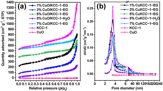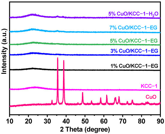 The XRD spectrum of the CuO/KCC−1 series catalysts are shown in Figure 4. It can be seen that a broad diffraction peak appears at a 2θ value at 22.58°, which corresponded to the characteristic diffraction peak of the amorphous SiO2 of the mesoporous molecular sieve KCC−1 [18]. The pure CuO sample shows a characteristic diffraction peak typical of CuO with a strong peak intensity, indicating a high degree of crystallinity of CuO. For the CuO/KCC−1−EG catalysts impregnated by ethylene glycol, the characteristic diffraction peaks of CuO species were not detected even though the loading of CuO was as high as 7%, indicating that the CuO species were highly dispersed on the surface of KCC−1, which is consistent with their SEM and TEM results. When the impregnating solution was changed to deionized water, faint characteristic peaks of CuO species could be detected. The above XRD results show that the CuO nanoparticles were highly dispersed on the KCC−1 support and the use of ethylene glycol as the impregnating solution was more favorable to the high dispersion of Cu species on KCC−1 than deionized water.