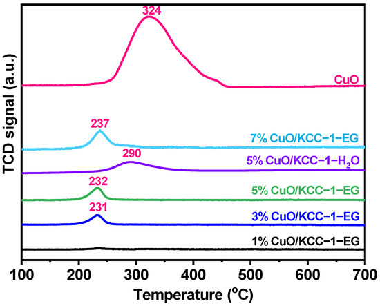 Figure 6 depicts the H2-TPR curve of the CuO/KCC−1 catalysts. Pure CuO displays a noticeable reduction peak with a peak temperature of 324 °C, which is related to the reduction of CuO to Cu [37]. The 1% CuO/KCC−1−EG has no obvious reduction peak. The reduction peak temperature of 3% CuO/KCC−1−EG is 231 °C, which is not much different from the reduction peak temperature of 5% CuO/KCC−1. When the Cu loading amount reaches 7%, the reduction peak temperature of Cu species shifts to a higher temperature, which is 237 °C. The intertwined abundant pores are beneficial to the transmission and diffusion of substances, and are beneficial to promoting the migration of active oxygen species and, thus, improving the reduction properties of the catalyst. This is the important factor for the improvement of the CO catalytic oxidation performance. In addition, it can be seen that when the impregnating solution was changed from ethylene glycol to deionized water, the reduction peak temperature of the catalyst shifted to the higher temperature, which indicates the decreased reduction property, and that it is consistent with the weaker CO catalytic performance over the 5% CuO/KCC-1-H2O catalyst.