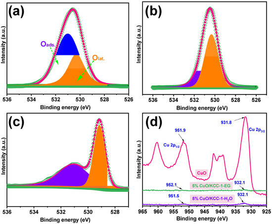 The O 1s XPS patterns (a) 5% CuO/KCC−1−EG; (b) CuO; (c) 5% CuO/KCC−1−H2O); (d) Cu 2p XPS patterns) of the catalysts.