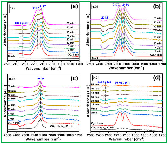 In this section, in situ DRIFTS measurements for as-synthesized 5% CuO/KCC−1−EG and CuO were performed at 100 °C to better understand the CO adsorption behavior. As shown in Figure 8a,b, the bands located at 2119~2127 cm−1 and 2162~2172 cm−1 were observed in both catalysts when exposed in a CO atmosphere, which were attributed to the CO adsorption on Cu+ (Cu+–CO) species and gaseous CO species [4], respectively. The intensity of the adsorption peak over the 5% CuO/KCC−1−EG was higher than that of CuO, which indicates that 5% CuO/KCC−1−EG is more beneficial to the adsorption of CO. The bands located at 2336~2363 were ascribed to gaseous CO2 [4,42], suggesting the incoming CO reduced the surface species of oxides. After being treated with CO for an hour, the catalysts were purged with N2 for 30 min. As presented in Figure 8c,d, the band corresponding to gaseous CO2 disappeared and the band ascribed to Cu+–CO still existed over the CuO catalyst, the peak intensity decreased with the time of the O2 treatment, but the peak intensity was still high when exposed in an O2 atmosphere for an hour. However, for the 5% CuO/KCC−1−EG catalyst (Figure 8d), two big bands appeared when the gas was shifted to O2 for only 1 min: gaseous CO2 and Cu+–CO species emerged simultaneously, and the intensity declined sharply and almost completely disappeared when treated with O2 for an hour. The above results indicate that 5% CuO/KCC−1−EG was more beneficial to the adsorption of CO and the decomposition of Cu+–CO species: this may be an important reason for its better catalytic activity than that of CuO.