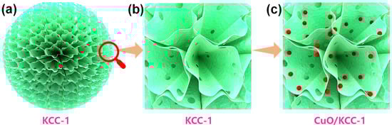 Diagram of the surface spatial confinement strategy ((a,b): KCC−1; (c): CuO/KCC−1, red spheres: CuO NPs).