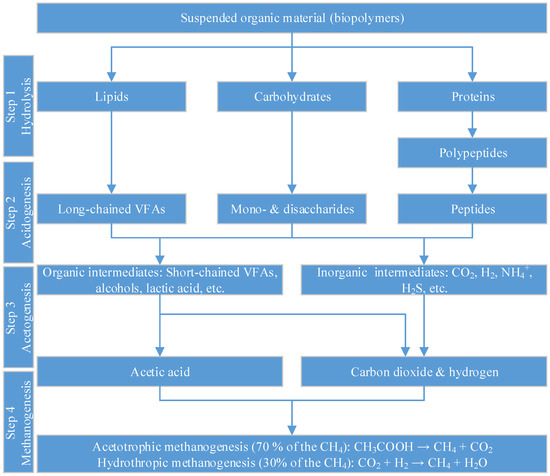 Breakdown of the AD process. Modified from Madsen et al. [17]. Reproduced with permission of Renewable and Sustainable Energy Reviews (Elsevier).