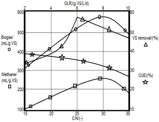 Application of the concept of CUE from soil science to the AD process. The relation between the CUE and the C/N for terrestrial decomposers was taken from the Figure 1a of Sinsabaugh et al. [53]. Reproduced with the permission of Ecology Letters (John Wiley & Sons). The relation between the biogas yield, the methane yield, and the vs. removal with the C/N for the operation of a discontinuous reactor was taken from Figure 3 of Wang et al. [58], who carried out 30-day AD experiments with a S/I of 0.5 (expressed in terms of VS). Reproduced with the permission of Bioresource Technology (Elsevier).