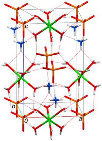 Structure of the struvite represented by Prywer et al. [120]: the magnesium (green) is surrounded by 6 molecules of water (oxygen in red and hydrogen in white) and the nitrogen (blue) and the phosphorus (yellow). Using the coordinate system adopted by Prywer et al. [120] and the hydrogen-bond network marked with dotted lines. Reproduced with the permission of Crystals (MDPI).