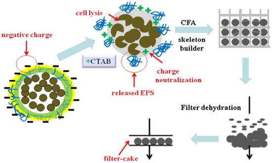 The studies of Ma et al. [142] and Mor et al. [139] provided contrary results regarding how the pH and the level of swelling/hydration affect the adsorption. The dehydration without acidification was tested by Zheng et al. [28]. They used a cationic surfactant (cetyltrimethylammonium bromide; CTAB) together with CFA to ease the filtration of the anaerobic digestate (Figure 7). The CTAB neutralized the negative charges on the surface of the flocs of the anaerobic digestates, reduced the electrostatic repulsion between the flocs, and promoted coagulation-flocculation. Moreover, the neutralization of the charges allowed the release of the extracellular polymeric EPS of the cells and fiber of the digestates and bound water molecules. The proteins and polysaccharides are components of the EPS that largely contributed to enhance the binding ability of water to the flocs of the digestate. Award et al. [143] divided the EPS into subgroups of main sources of carbon, nitrogen, and phosphorus. An example of EPS-phosphorus moieties would be nucleic acids [144]. After the release of the hydrated EPS from the flocs surface, the bound water that was coordinated with the EPS became free water [28]. On top of that, the CFA acted as a rigid lattice to reduce the filter cake compressibility and to provide drainage pathways for water to exit the filter cake [28].