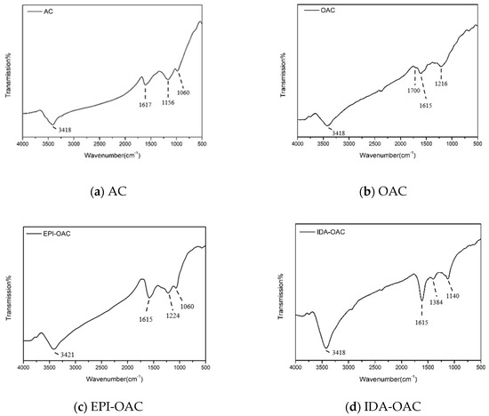 The FT-IR spectra of possible functional groups on adsorbents are presented in Figure 1. For AC, because these carbons were activated by phosphoric acid, the peaks at 1156 cm−1 and 1060 cm−1 could be assigned to bending vibrations in C-OH bonds and vibration of the polyphosphate chain, respectively [30]. The peak around 1617 cm−1 could be attributed to C=C stretching vibration from the aromatic ring and conjugated C=O bond [31]. Furthermore, the board band between 3250 to 3700 cm−1 represent the overlapped stretching and vibration from amine groups(-NH) and hydroxyl groups(-OH) [32]. This observation was found in OAC and IDA-OAC also. After the nitric acid treatment, the peak was observed at 1700 cm−1 due to the C=O stretches of carboxyl or carbonyl groups [33], and the C-O stretching at 1216 cm−1 [34] proved that oxidation generates more oxygenated functional groups on the activated carbon. With the iminodiacetic acid grafted, the absorption bands at 1224 cm−1 and 1060 cm−1 related to C-O epoxyl and alkoxyl groups on EPI-OAC disappeared [21]. Then, the characterization of peaks related to bending vibration of N-H or stretching vibration of -C=O was shown at 1615 cm−1 [30,32]. The peaks at 1384 cm−1 and 1140 cm−1 corresponded to C-N stretching [35], indicating the IDA was successfully grafted on OAC [36].