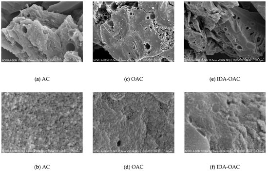 The surface morphology information was obtained through the SEM technique. The SEM images (Figure 2) of AC, OAC, and IDA-OAC reveal the difference between the materials before modifying and after. As illustrated in Figure 2a, the activated carbon fabrication from waste wood-based panels had some open pores on the surface. In Figure 2b, homogenous porosity was observed when the magnification was enlarged [24]. After treating with the nitric acid, Figure 2c–f displayed the open pores obviously and exhibited a heterogeneous surface with porosity. This could be attributed to nitric acid destroying the pore wall and causing the pore structure to collapse [38]. In addition, although Figure 2c,e was not much different, Figure 2d,f demonstrated that in OAC after grafting with iminodiacetic acid, the surface of the adsorbent became coarser and fluffier. This phenomenon confirms that the functional ligand bonding with the OAC surface provides more active sites to the adsorbate [39].