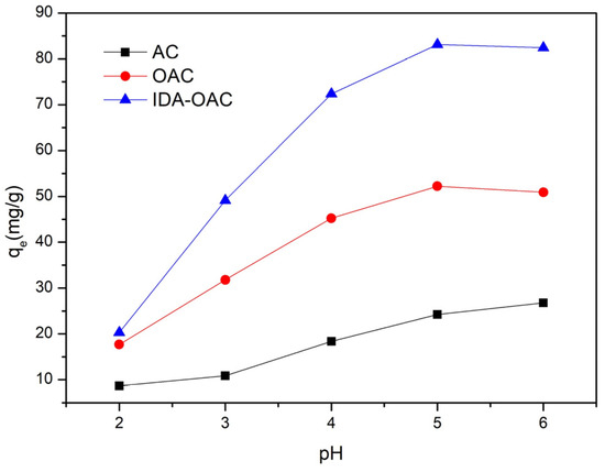 Because the different solution pH strongly affects the form of the surface charge on the adsorbent and the state of the copper for adsorption capacity, the pH value is a significant factor for the adsorption process [15]. As seen in Figure 3, the phenomenon can be observed that more copper adsorption on the three kinds of adsorbent follows the increasing pH value (2 to 6). Junior et al. used chelating resin with the iminodiacetic acid group to recover Cu2+, and found that the adsorption of the metal increases with the higher pH, although the adsorbent was more selective for metals at low pH value [23]. The lowest adsorption quantity was found at pH 2 due to more hydrogen ions being competitive with copper ions for the active sites in the solution [5]. At pH 6, more OH− ions might exist in the solution, causing hydrolysis or the precipitation of copper, affecting the adsorbent capacity [27,42]. Thus, the optimum pH was 5 for this study. In addition, through the measurement of point of zero charges, the surface charge of adsorbents is shown in Table 1. The surface of the adsorbent was more positively charged when the pH is <pHpzc; this could cause electrostatic repulsion between the adsorbent and the metal. On the contrary, if the solution pH > pHpzc, the functional group on the adsorbent is negatively charged because of the deprotonation [21]. This phenomenon enhances the affinity to copper ions. The AC, OAC, and IDA-OAC of pHpzc indicated that adsorbents present a weakly acidic characteristic; they efficiently operate at higher pH values. Xie et al. presented the same result in which the adsorption capacity for copper became higher when pH was increased by using the acidic adsorbent [42]. For the above reasons, a solution of pH 5 was used in the following experiments.