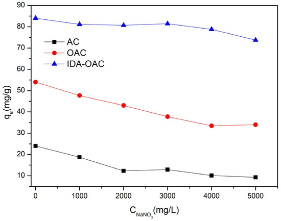 The ionic strength study is significant for the adsorbents in practical operations. Therefore, we investigated the effect of AC, OAC, and IDA-OAC on adsorption with various concentrations of NaNO3 (1000~5000 mg/L). As shown in Figure 4, the adsorption capacity decreased with the increase in ionic strength. This could be attributed to competition between Na+ and Cu2+ for the adsorption sites [26]. In addition, the IDA-OAC exhibited a relatively stable adsorption capacity in high ion strength. It could also adsorb 69.7 mg copper ions per gram in the environment containing 5000 mg Na+. This demonstrates that the iminodiacetic acid prefers to combine with Cu2+ than Na+ and that providing a ligand for inner-sphere surface complexation reduces the influence of the variation of ionic strength [23,28]. Li et al. used an adsorbent with a dithiocarbamate functional group to uptake lead in high concentrations of sodium, which maintained high adsorption capacity because the sulfur atoms could provide ligands for the metals [28].