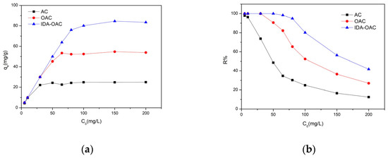 The adsorption capacity (a) and the removal efficiency (b) for AC, OAC, and IDA-OAC in the different initial concentrations.