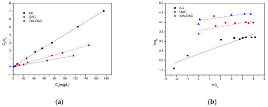 (a) Langmuir isotherm and (b) Freundlich isotherm model plots of AC, OAC, and IDA-OAC adsorption for Cu(II).