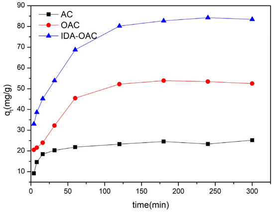 To assess the adsorption rate and the equilibrium time between adsorbate and copper ions, the result of contact time on the adsorption capacity is displayed in Figure 7. In the beginning, the removal of Cu(II) rapidly increased for AC, OAC, and IDA-OAC as the contact time increased. In 60 min, most of the adsorbates were attracted to IDA-OAC (more than 80% of the adsorption capacity). The reaction became slow until it finally reached equilibrium at almost 120 min for the three adsorbents, and the adsorption capacity depended on different materials. The fact that adsorbents can uptake copper ions quickly at first might be attributed to a higher driving force and the amount of uncovered active sites on the adsorbents [39]. Subsequently, the adsorption rate slows for the adsorption sites after saturation. Aryee et al. reported that the copper adsorption on modified peanut husk went through two stages and reached equilibrium by three hours [26]. Laconica et al. used triethylenetetramine to modify mesoporous silica particles and removed copper ions in eight hours [47].