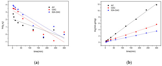 Linear plots of (a) pseudo-first-order kinetic and (b) pseudo-second-order kinetic models of AC, OAC, and IDA-OAC adsorption for Cu(II).