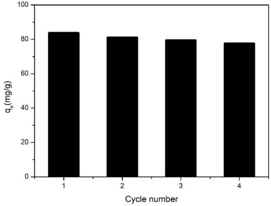 In the reusability experiments, to use the 0.1 M HCl, 0.1 M H2SO4, and 0.1 M HNO3 were conducted in the regeneration of IDA-OAC, respectively. The results revealed 0.1 M HCl had higher desorption efficiency (96.89%) than 0.1 M HNO3 (86.47%) and 0.1 M H2SO4 (82.02%). Therefore, the 0.1 M HCl was the eluent for desorption of IDA-OAC. Figure 9 presents the four adsorption–desorption cycles. The adsorption efficiency decline could be because some copper ions were stuck in the adsorbents because the IDA-OAC had high porosity [12]. Or perhaps, the Cu2+ occupied the active site and had not been released during the desorbing process [44]. Although the adsorption capacity decreased gradually, it could also maintain high adsorption capacity (77.56 mg/g) after four cycles, which means IDA-OAC is an economical and efficient adsorbent for water treatment.