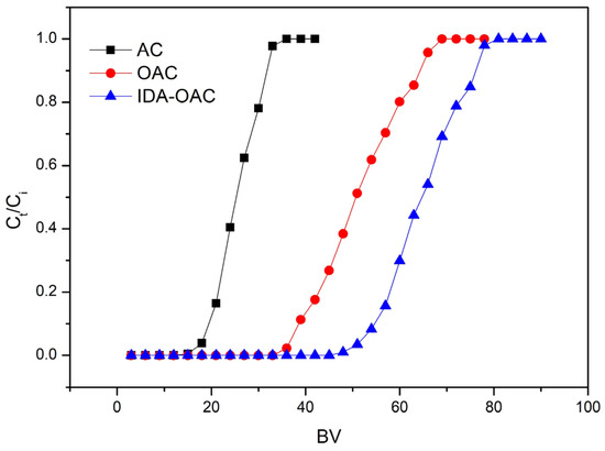 To enhance the application of the AC, OAC, and IDA-OAC in practice, Figure 10 illustrates the different adsorption abilities for the adsorbents in the column scale. The breakthrough curve can provide better awareness of the adsorbents characteristic to control the effluent from industry in practical applications. For AC, the breakthrough points (Ct/Ci = 0.05) and the exhaustion points (Ct/Ci = 0.95) are seen at 19 BV and 32 BV, respectively. Relatively, the OAC and IDA-OAC had higher bed volumes for breakthrough points (37 BV and 52 BV) and exhaustion points (66 BV and 77 BV). This means oxidized, activated carbon and grafted functional groups can also enhance the performance of sorption copper ions for adsorbents in the column scale. Further, the total removal efficiency for IDA-OAC was 83.54%, clearly higher than OAC (74.63%) and AC (73.53%). This result can ensure that the adsorbate is removed more effectively from the aqueous solution by IDA-OAC.