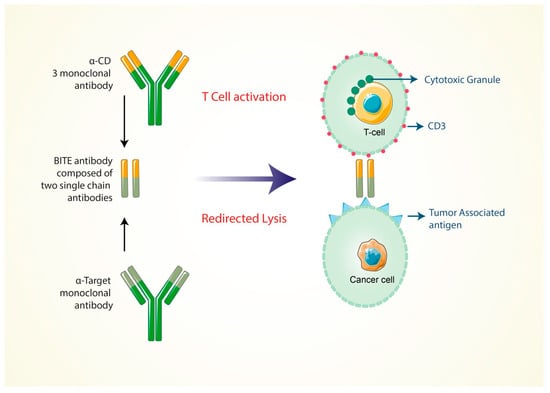 Independently, the production of antibodies can enhance the specificity of the T-cell receptor, co-stimulation or presentation of peptide antigens. Various research activities have demonstrated that, among bi-specific antibodies derived from T cells, the BITE (bi-specific T-cell engager) antibodies show a promising efficacy in the treatment of both bulky and minimal residual disease [], and now it is FDA approved for treating several cancers. Kufer and colleagues’ research project showed that the special design of the CD3/target antigen-associated bi-specific antibodies has a very high rate of efficiency and can also involve CD8+ and CD4+T cells to redirect the cancer cell lysis process to the target (E–T ratio) ratios []. When the bi-specific antibodies bind only the CD3-specific branch, this shows low efficiency as the monovalent antibodies cannot trigger the T-cell signaling by CD3 (Figure 2). Contrary to this, the “bi-specific T-cell engager” (BITE) antibody is activated to the T cell through the multivalent strategy by the target cells [,]. In an in vitro study, the BITE antibody was found to be highly effective at redirecting the damaging response of cancer cells. Additionally, the drug’s potent antitumor activity has been demonstrated in a variety of animal models [,].