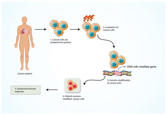 Cancer treatment vaccines enhance the immune system’s capability to signify and damage the cancer antigens more effectively. Cancer cell’s possess specific molecules, named cancer specific antigens, for every type of cancer cell on their cell surface, but they are absent in healthy cells. Generally, cancer vaccines can be produced for individual cancer patients. These categories of cancer vaccines are composed from the tumor sample of the individual cancer patient (Figure 3). For that, surgery is required to find a large enough sample of the tumor cells to make the vaccine against these cancer cells. There are two types of vaccine in cancer treatment. They are the personalized cancer vaccine and the vaccine to target specific cancer antigens [].