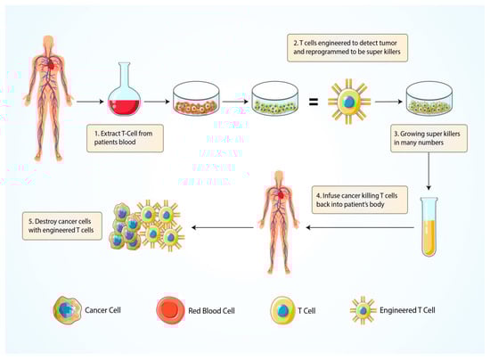 T-cell therapy for cancer treatment mainly relies on the ability to genetically engineer cells with targeted antigen specificity and then induce the cell to proliferate by preserving their effector function and homing abilities. Mouse models have usually been used for the identification and preclinical optimization of tumor therapy; nevertheless, no mouse models have been found that can be used as good predictors of a successful human response to immunotherapy. In recent times, substantial limitations in some mouse models have been found that have important indications for T-cell cancer therapy. In particular cases, it has been reported that many mouse tumor antigens do not represent human tumor antigens [], which has led to strategies to generate transferred human T cells with the appropriate specificity of tumor. T-cell therapy can be used as an efficient treatment for viral infections and the early stages of cancer. Antiviral immunological processes are complicated and involve both adaptive and innate responses mediated by CD8+T cells, whose specific immunosurveillance functions have been examined in a variety of clinical and experimental conditions. The rapid, powerful, cytotoxic and non-cytolytic antiviral actions of CD8+T cells are certainly crucial to defending the host from various viral diseases []. Recent studies focused on cellular immunology and tumor biology have shown new strategies for adoptive T-cell therapy. For example, the use of engineered T cells has been tested as a strategy to increase the function of memory T cells and effector T cells through manipulating the host to suppress the immune toxic effect in the tumor microenvironment, with a promising result in the early stages of clinical trials []. Many research studies have reported that using the T cell for cancer treatment shows effective results and this plays a significant role in cancer therapy []. Adoptive T-cell therapy is used for the goal of eliminating a tumor and its recurrence, which consists of various mature T cells. Lymphocytes with inhibitory effects on the growth of cancer cells were observed in many patients who are potential candidates for immunotherapy []. The main advantages of using T cells for immunotherapy for cancer treatment instead of other cytolytic cells, such as NK cells, is that T cells have the ability to bind specifically on target tumor cells by the recognition of differentially expressed tumor proteins, which are present on the cell surface. As the T cells have a long clonal life span, this allows for both immunoprophylactic and therapeutic scenarios, and is also a great advantage for cancer treatment. Moreover, T cells can be well suited for genetic manipulation, which enables the evaluation of genetically-enhanced T cells for cancer and other diseases.