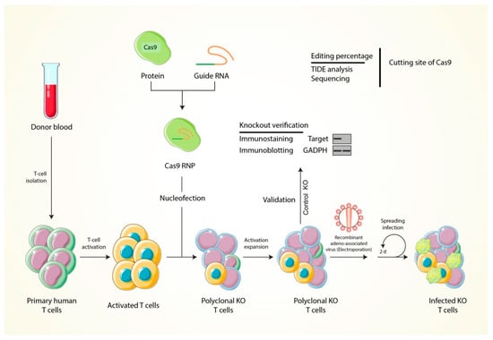 - Schumann, K.; Lin, S.; Boyer, E.; Simeonov, D.R.; Subramaniam, M.; Gate, R.E.; Haliburton, G.E.; Ye, C.J.; Bluestone, J.A.; Doudna, J.A.; et al. Generation of knock-in primary human T cells using Cas9 ribonucleoproteins. Proc. Natl. Acad. Sci. USA 2015, 112, 10437–10442. [Google Scholar] [CrossRef] [PubMed] [Green Version]