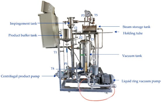 The process can be described as follows. A centrifugal pump is used to pump the product from the buffer tank to the impingement tank to be impinged directly with the pressurized steam. The product is rapidly heated to the sterilization temperature by impinging and mixing it with steam. The product with condensate passes through the holding tube for the required amount of time. The product is cooled instantly using flash cooling by passing the liquid through a vacuum chamber (average vacuum pressure of −690 mmHg). The cooling mechanism for such systems must be rapid and must remove any excess water resulting from the condensation in the direct heating method [,].
