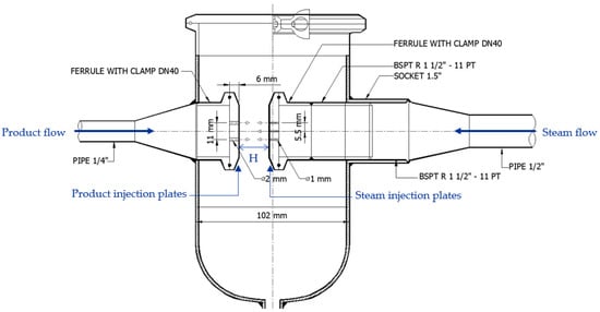 In a direct heating method, when the steam comes into contact with the product it condenses and releases latent heat causing the product to heat up very quickly with less fouling problems compared to an indirect method []. The process of injecting steam into a product is called injection, while the process in which a product is injected into steam is called infusion []. Direct contact condensation of the steam jet in subcooled water has been widely used in various processes [].