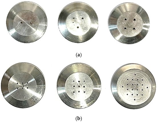 The impingement tank (Figure 2) was made from stainless steel and was fitted with two pipes on opposite sides which were used for the inlet of product, and steam for direct collision, respectively. Both fluids flowed through the injection plate attached to the flow channel outlet. The injection plates were designed as a multiple impingement jet with an orifice to increase the heat transfer rate [,]. The injection plates were changeable to allow the investigation of different numbers of nozzles, which have an inverse relationship to the jet velocity and Reynolds number. The product injection plates were formed with two, three or four circular holes with a diameter of 2 mm, as shown in Figure 3a. The steam injection plates were formed with six, nine or twenty circular holes with a diameter of 1 mm, as shown in Figure 3b. The pitch between nozzles (defined as the pitch distance to nozzle diameter or t/d) was set at 5.5. Geers [] and Specht [] reported that the optimum value of t/d was 5–6 to provide the highest average heat transfer. The distance between the product and the steam injection plates (H) could be adjusted in the range 1–12 mm using a threaded socket.