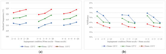 Experiments were conducted to study the influence of the jet Reynolds number and steam temperature on the sterilization temperature and efficiency of heat transfer at H/d = 5. The Reynolds number represented the nozzle design based on the product injection plates formed with two, three or four nozzles (diameter 2 mm) and steam injection plates formed with six, nine or twenty nozzles (diameter 1 mm). Furthermore, the effect was investigated of the steam temperature (120, 125 or 130 °C) on the steam jet Reynolds number; the results are shown in Table 2. The relationship of the sterilization temperature and heat transfer efficiency for various impingement conditions is shown in Figure 4. The sterilization temperature tended to increase as the steam jet nozzle increased (six, nine or twenty) for all water jet nozzle numbers (two, three and four), which was directly proportional to the steam flow rate. The increase in the number of jets would be expected to increase the average heat transfer as more of the surface is exposed to the high transport region in the stagnation zone []. Except for the conditions with a steam temperature of 120 °C, with two water nozzles and six steam nozzles, the sterilization temperature was higher than with nine steam nozzles because the Reynolds numbers of the water and steam were the highest due to the increased turbulence intensity, and the jet Reynolds number having a large effect on the heat and mass transfer rates [].