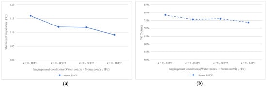 Relationship of sterilization temperature with: (a) % heat transfer efficiency (b) jet nozzle numbers of water and steam at 2 × 6 and steam temperature at 120 °C and various H/d values (t/d = 5.5).