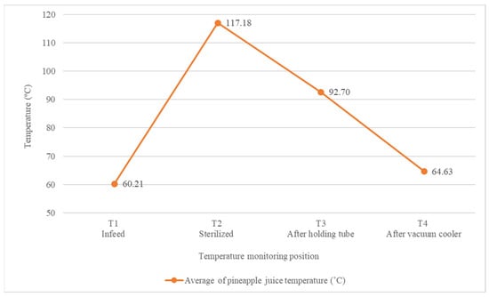 The highest heat transfer efficiency conditions were for jet nozzle number of pineapple juice and steam = 2 × 6, H/d = 1 and t/d = 5.5 at an average steam temperature of 121.66 °C (average steam flow rate 10.96 kg/h) and a pineapple juice flow rate of 53.76 kg/h. The average temperatures of the pineapple juice infeed (T1) at sterilization (T2), after the holding tube (T3) and after the vacuum cooler (T4) were 60.21 °C, 117.18 °C, 92.70 °C and 64.63 °C, respectively, as shown in Figure 6. The average heat transfer efficiency was 77.87%.