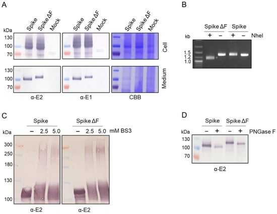 The Strep-tagged spikes and spikes ΔF were purified by their high selective affinity to Step-Tactin. The protein extract in medium fractions was filtered (0.2 μm filter Sartorius Stedim), loaded on a Strep-Tactin affinity column (Strep-Tactin XT Starter Kit (IBA Lifesciences, Gottingen, Germany)) and eluted in three fractions according to the manufacturer’s protocol. The collected elution fractions were used for baculovirus titrations, bis(sulfosuccinimidyl)suberate cross-linking, Western blotting and LC–MS/MS-based glycoproteomic analysis.