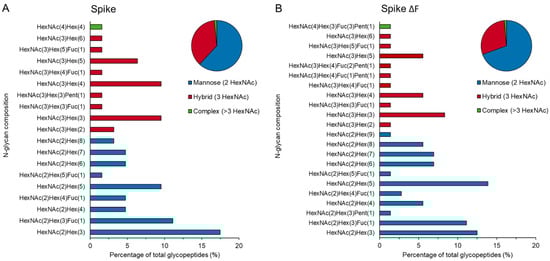 N-glycan composition of the CHIKV spikes with and without furin cleavage site (ΔF). Sf21 cells were infected with (A) Ac-Spike or (B) Ac-Spike ΔF, secreted spikes were purified from the culture fluid and analyzed for total N-glycan composition using LC–MS/MS-based glycoproteomic analysis. The bar graph provides a detailed description of the detected N-glycans. The pie chart represents a summary of the N-glycan structure types.