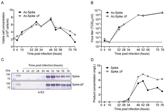 Industrial scale production of BEVS-derived products takes place in insect cells grown in bioreactors as suspension culture. To evaluate the potential for up-scaling spike production, Sf9 suspension cells were infected in shake flasks with Ac-Spike and Ac-Spike ΔF under previously determined optimized conditions based on product yield []. Infections were performed at a low MOI of 0.01 TCID50/cell to enable the Sf9 cells to proliferate in the first 46 h post infection (hpi) up to a viable cell concentration of 7.8 × 106 cells/mL (Figure 4A). The recombinant baculovirus titers showed a similar trend in viral growth, reaching 1 × 106 TCID50/mL at 46 hpi (Figure 4B). When the baculovirus concentration plateaued from 46 hpi onwards, the viable cell concentration decreased due to baculovirus-induced cell death. The highest spike and spike ΔF product yields were reached at 52 hpi with protein concentrations of 5.8 and 7.6 mg/L, respectively (Figure 4C,D). Thereafter, the spike protein concentration reduced by cell lysis induced protein degradation. Furthermore, a double band pattern appeared, suggesting the presence of glycosylated and non-glycosylated spikes. Based on the quantified protein concentrations, spikes and spikes ΔF produced in Sf9 suspension cells should be harvested around 50 hpi to generate optimal product yields.