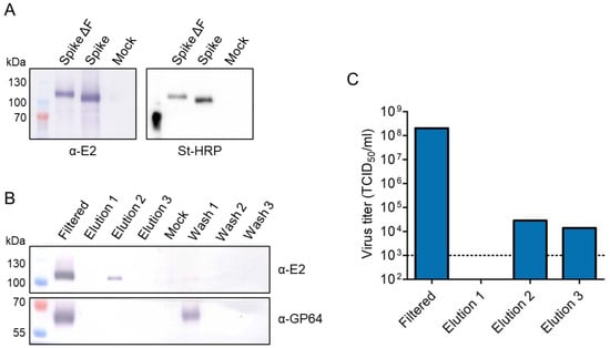 Strep-Tactin affinity column purification of Strep-tagged spikes. Sf21 cells were infected with Ac-Spike and Ac-Spike ΔF. Medium fractions were harvested, 0.2 μm filtered and purified using a Strep-Tactin affinity column. (A) Secreted proteins in the filtered medium fraction were analyzed on a CHIKV α-E2 Western blot and Strep-tag-conjugated St-HRP Western blot. (B) Secreted proteins in the filtered medium, and Strep-Tactin wash and elution fractions were analyzed on a CHIKV α-E2 Western blot and baculovirus α-GP64 Western blot. (C) Baculovirus titers in the filtered medium and Strep-Tactin elution fractions were determined by end-point dilution assay (threshold indicated by dotted line).
