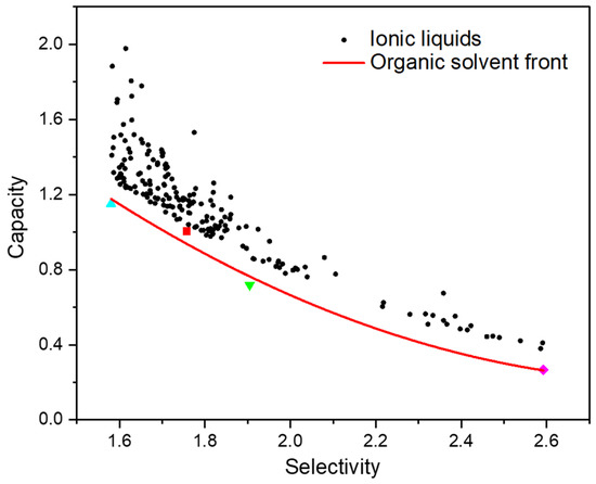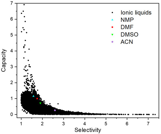 The capacity and selectivity of NMP, DMF, DMSO and ACN are also depicted in Figure 1. Obviously, many ILs have larger capacity and selectivity than these four organic solvents. A boundary front was regressed based on the four solvents to explicitly screen ILs. As shown in Figure 2, two empirical selection criteria were defined to exclude the ILs with moderate performance. The first was that the capacity difference between the promising ILs and the boundary front should be larger than 0.1. The second was that the selectivity of ILs should be between those of NMP and ACN. Accordingly, as listed in Table S3 (Supplementary Materials), 190 out of 36,180 ILs met the two thermodynamic criteria and thus were retained.