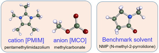 The η, log EC50 and Tm of the 190 ILs were further checked and the results are given in Table S4 (Supplementary Materials). Given the physical property constraints of Equations (5), (6) and (8), it was found that only one IL [PMIM][MCO] satisfied the three physical property constraints in Section 2.2. [PMIM][MCO] comprises of 1,2,3,4,5-pentamethylimidazolium (cation No. 48) and methylcarbonate (anion No. 64). Its melting point and viscosity were 260.34 K and 136.37 cp, respectively. In addition, the logEC50 values were 3.19 and 3.37, predicted by the FNN and SVM model, respectively. In this case, [PMIM][MCO] is regarded as a promising solvent for separating 1,3-C4H6 and n-C4H8. The structure information of [PMIM][MCO], along with the benchmark solvent NMP, is shown in Figure 3. Both were subsequently employed and compared as the entrainer for the ED process simulation.
