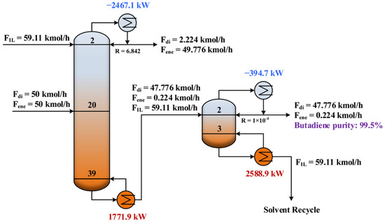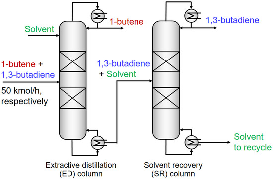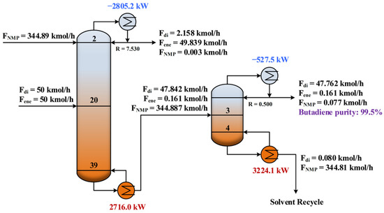 Flowsheet of the ED process for 1,3-C4H6 and n-C4H8 separation.