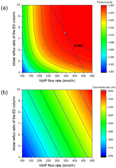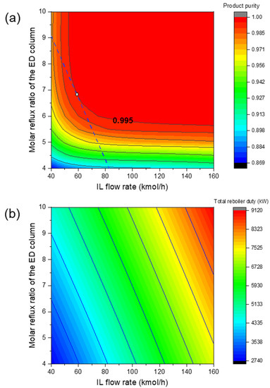 Based on the above process, preliminary simulations with different operating conditions were performed and it was found that the most important operating parameters were the solvent flow rate and the reflux ratio in the extractive distillation column. Therefore, these two critical operating conditions are regarded as process design variables. The other operating conditions (see Table 1) were simply fixed and the parameter sensitivity analysis was conducted on the two design variables in order to find the optimal operating conditions for minimizing the total reboiler duty of the two columns. Meanwhile, a 99.5% molar product (1,3-butadiene) purity was ensured. Given the optimal IL, Figure 5a,b illustrates the influences of the two process design variables on product purity and total reboiler duty, respectively. Similarly, Figure 6a,b shows the impacts of the two design variables when the NMP was used. The feasible operating areas that succeeded in meeting the separation task of 99.5% product purity are denoted as the red region. After comparing Figure 5 and Figure 6, it was found that for the IL-based process, the feasible area was larger and closer to the left lower corner. This means that a lower solvent usage and reflux ratio are required. This proves the advantage of the optimal IL.